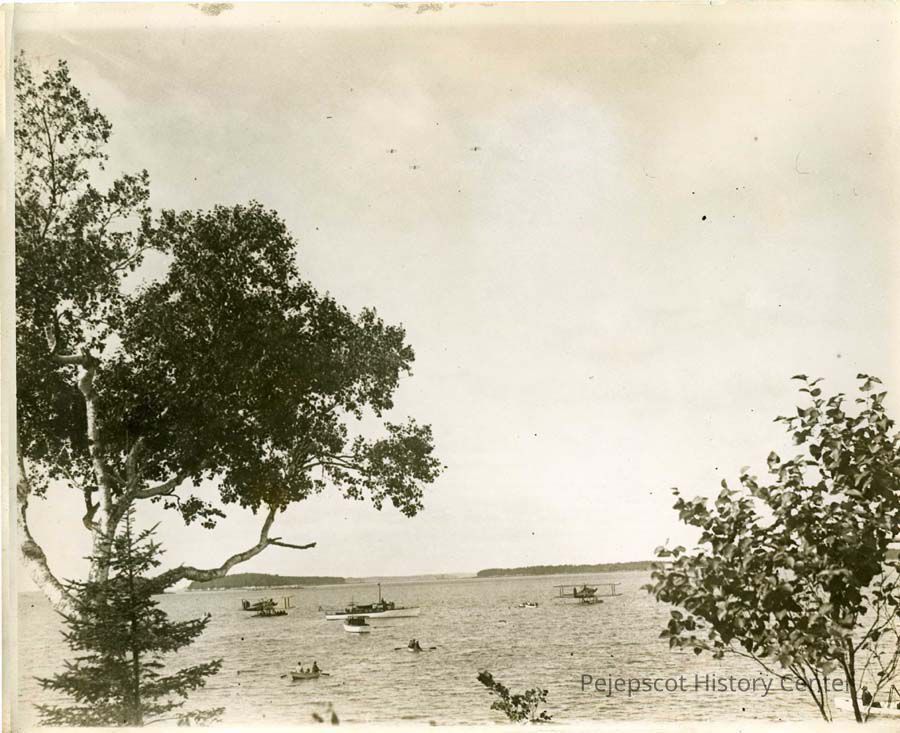 Planes "Chicago" and "Boston II" taken from Stetsons. Three planes in the air are escorts. Five boats in water.