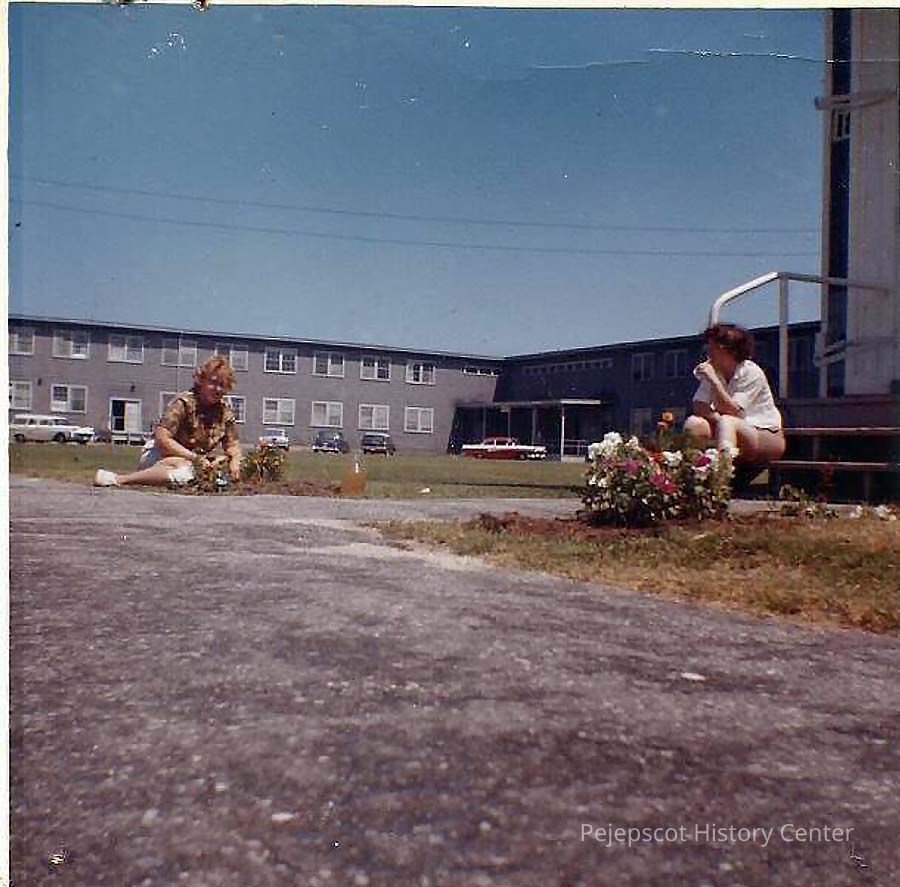 A color photo of Rose Brauner sitting on the steps watching Charlene Rusdorf plant flowers.