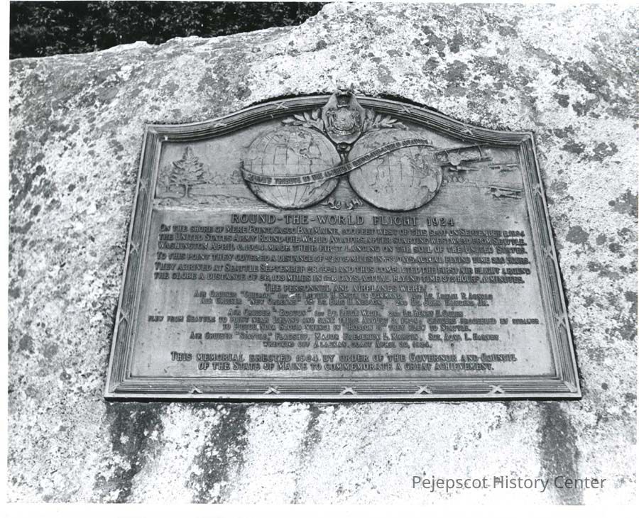 Photo of plaque on commemorative boulder in Monument Field, Mere Point, Brunswick, Maine. The plaque is in honor of the "Around the World Flyers" in 1924, who landed their sea planes off Mere Point after traveling most of the way around the globe. Their journey was finished later that year at Seattle, WA.Lexicon