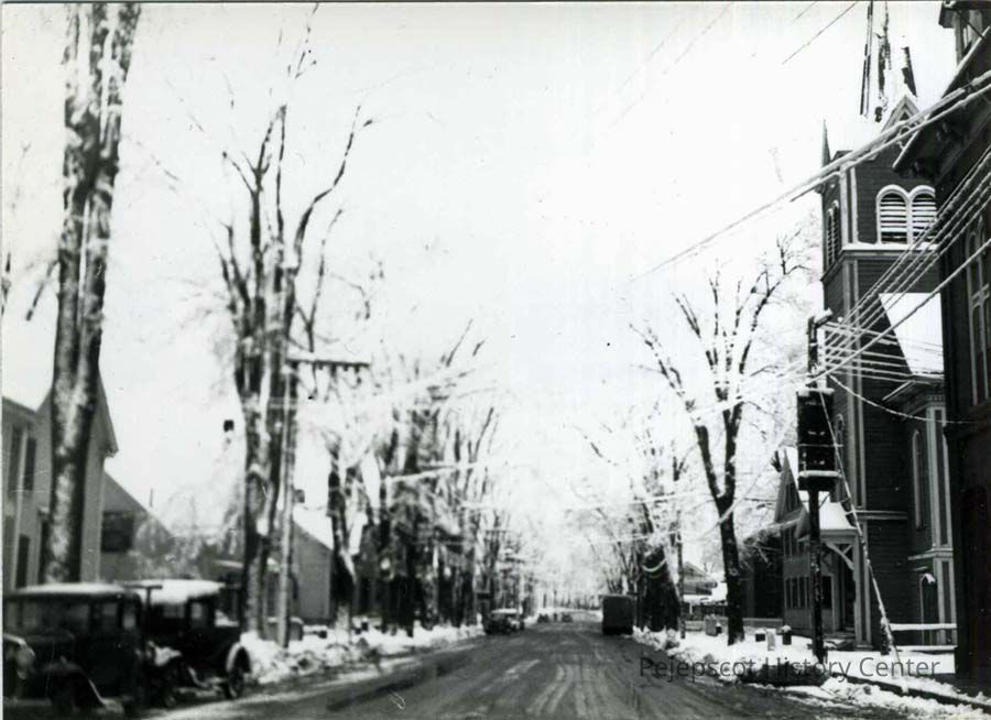 B/W photo of Pleasant Street, Brunswick, ME, in the winter. 4/3/1937