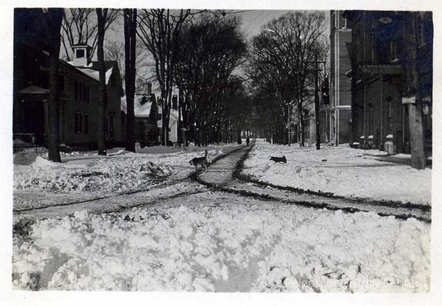 B/W photo looking up Pleasant Street from Maine Street the morning after a snow storm, April 3, 1924. Trolley tracks are visible.