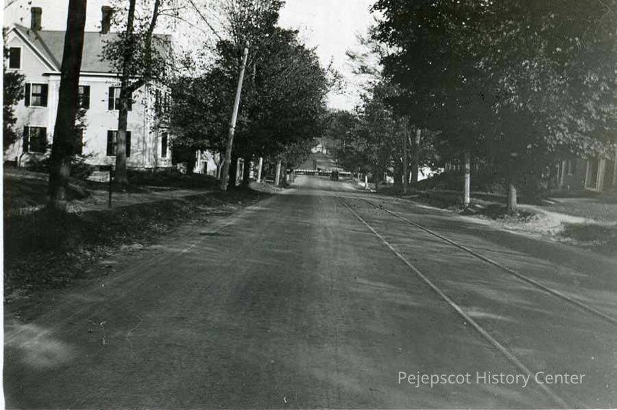 B/W photo looking west on Pleasant Street with its trolley tracks. The railroad crossing is in the distance.