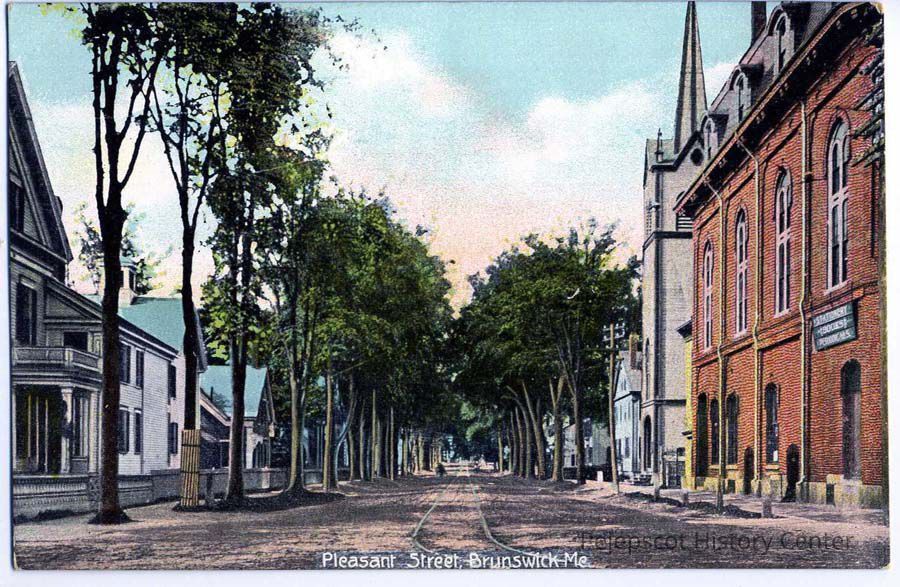 Color postcard of Pleasant Street, Brunswick, looking west from Maine Street.Lexicon
