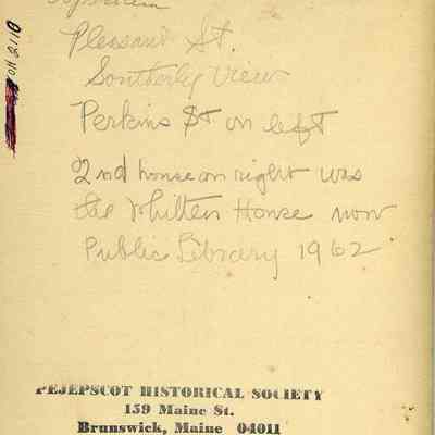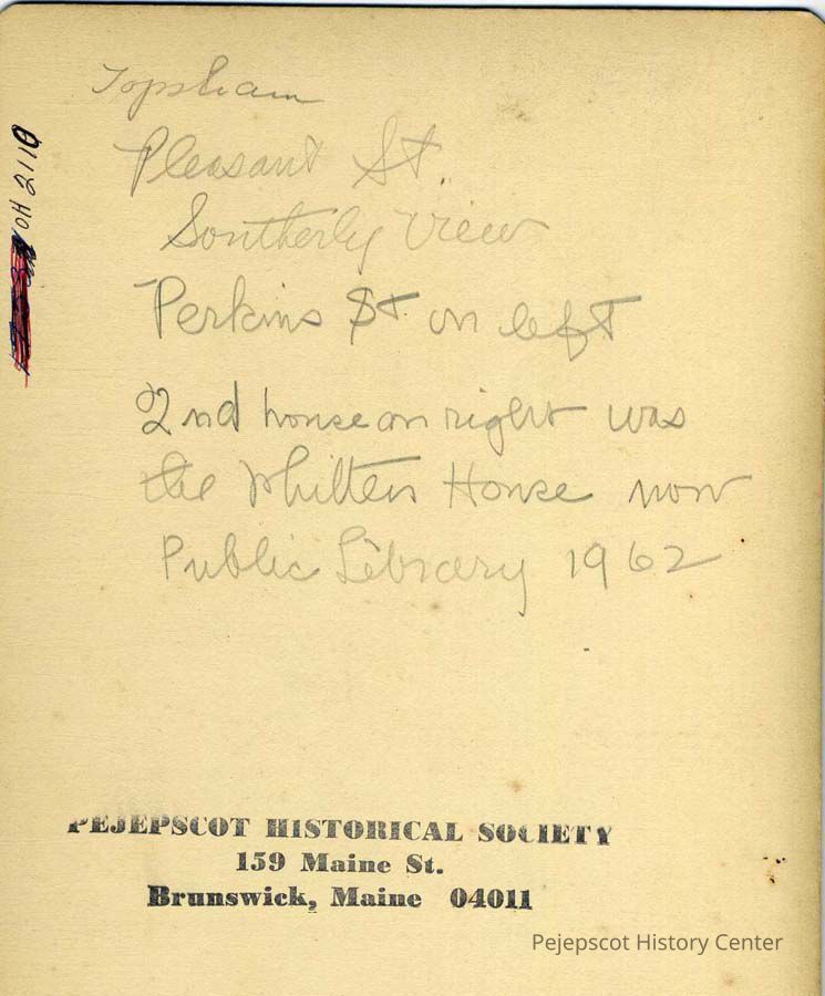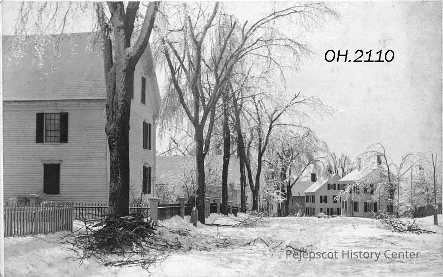 A B/W photograph of Pleasant Street, southerly view, Topsham, ME. Taken after an ice storm. Dated 1962.