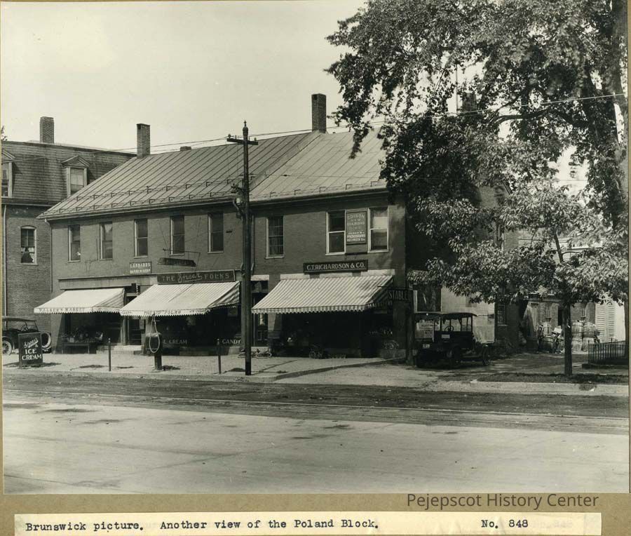 A black and white photo of the Poland Block in Brunswick. The photo shows such businesses as Walker's Market, Lombards Barber Shop, The Shear Folks, C.T. Richardson & Co. and Edison's Phonographic Records. Undated