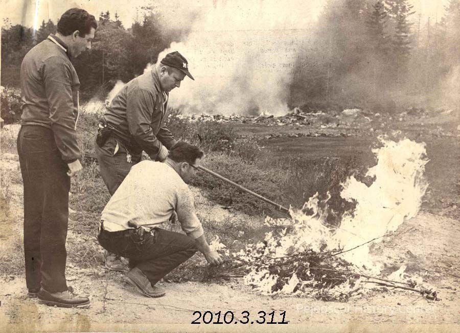 A B/W photograph of police setting fire to marijuana plants at the town dump. Photo was published 9/26/1969. Undated