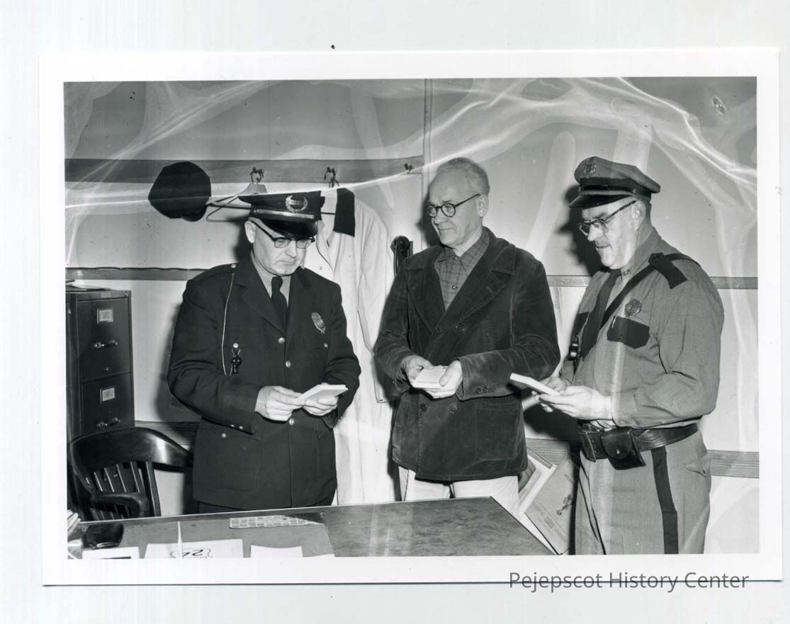 Police Chief Joel B. Lobel, an unidentified man, and State Trooper George Buzzell pose for the camera. Lobel and Bussell are reading something that the man in the center is showing them.