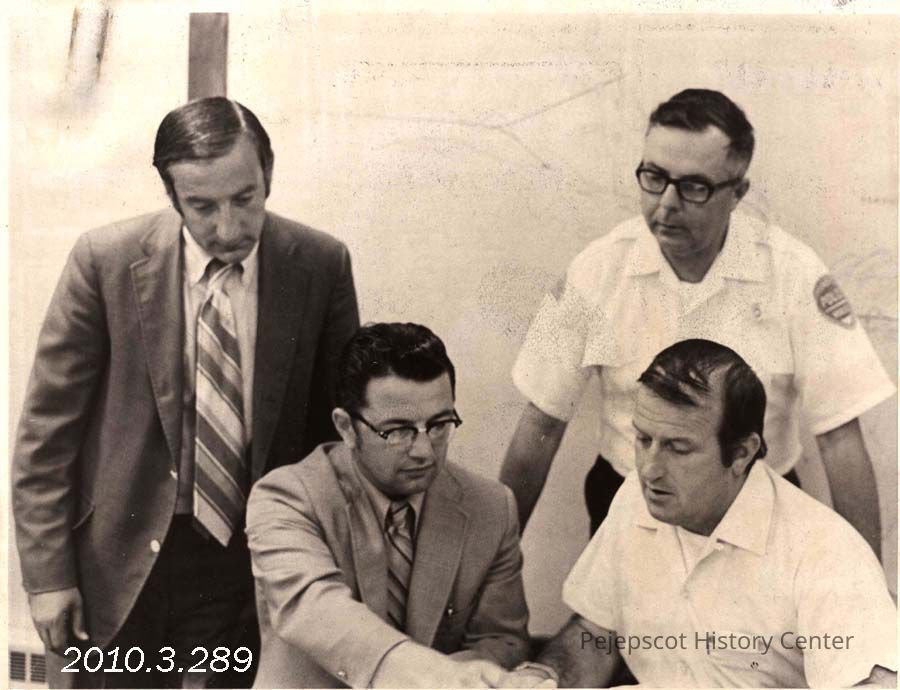 A B/W photograph of the Police Contract being signed by Det. Rene G. Sylvester and David Scarponi. Also pictured are William Trobb and Police Chief Clement G. Favereau. Photo was published 8/19/1971. Undated