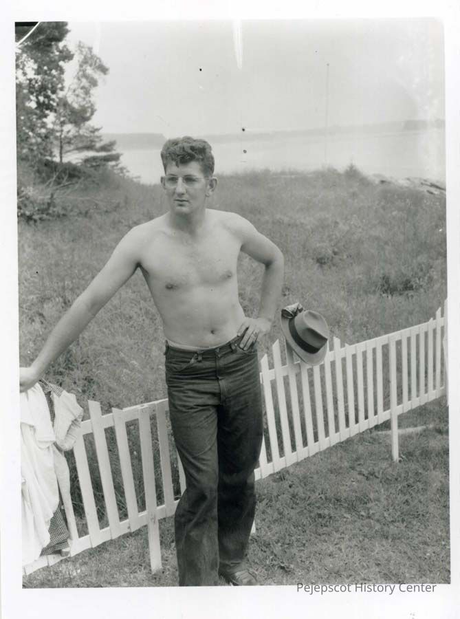 B/W photo of Patrolman Carroll E. Potter standing by a low fence, with a bare chest, at the sea shore on a police outing, 8/9/1953.