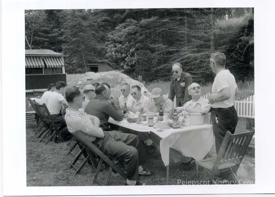 B/W photo of 12 policemen at a table eating at a police outing. It appears to be in the yard of a camp or cottage.