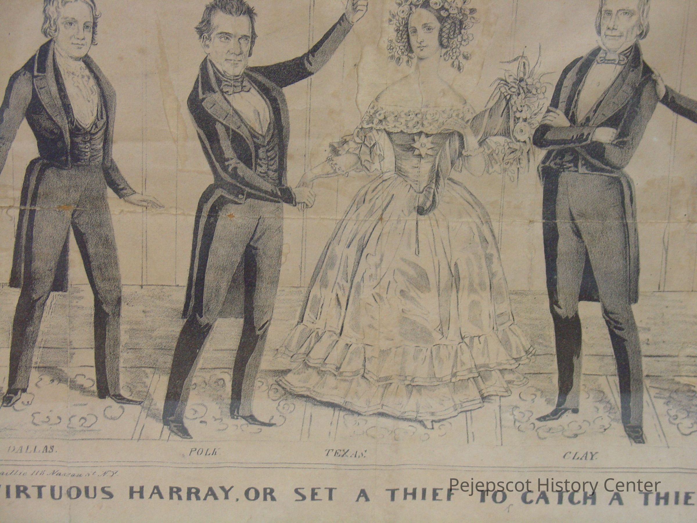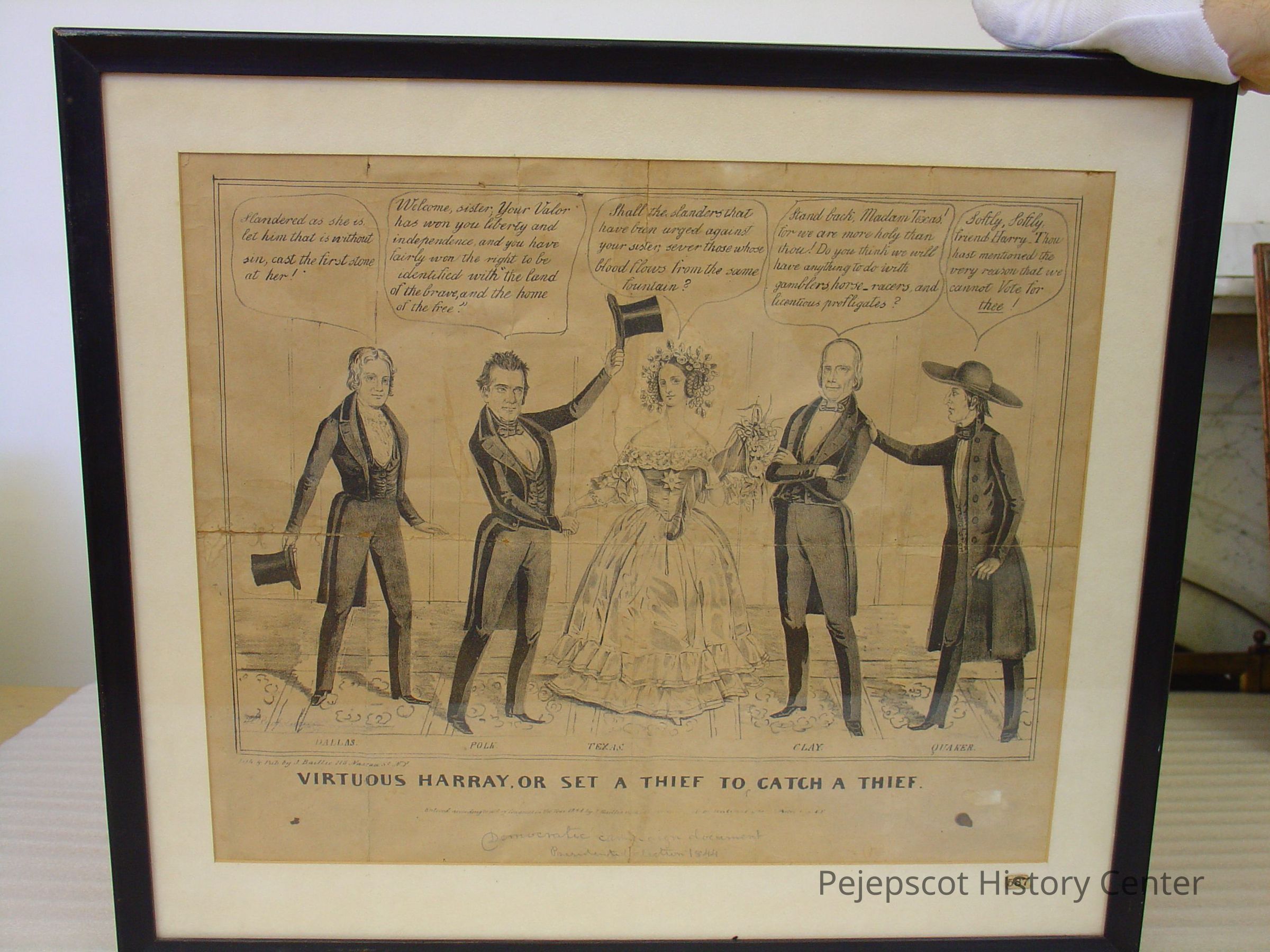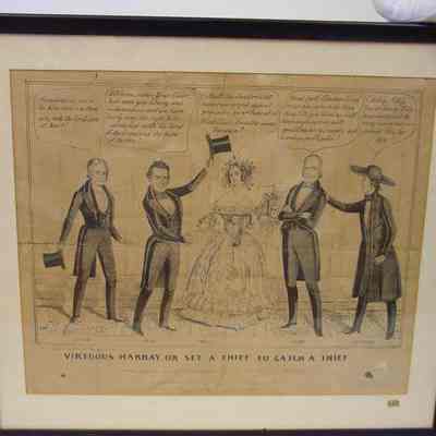 Wood framed political cartoon entitled, "VIRTUOUS HARRAY, OR SET A THIEF TO CATCH A THIEF." The cartoon shows 5 figures: Dallas, Polk, Texas, Clay and a Quaker in a fancy room. A pencilled note across the bottom reads, "Democratic campaign document/ Presidential election 1844." It gives a jab at Henry Clay. (See notes for text." At the bottom, "Entered according to act of Congress in the Year 1844 by J. Baillie in the clerks office . . . " illegible. "Lith & Pub by J. Baillie 118 Nassau St. NYLexicon