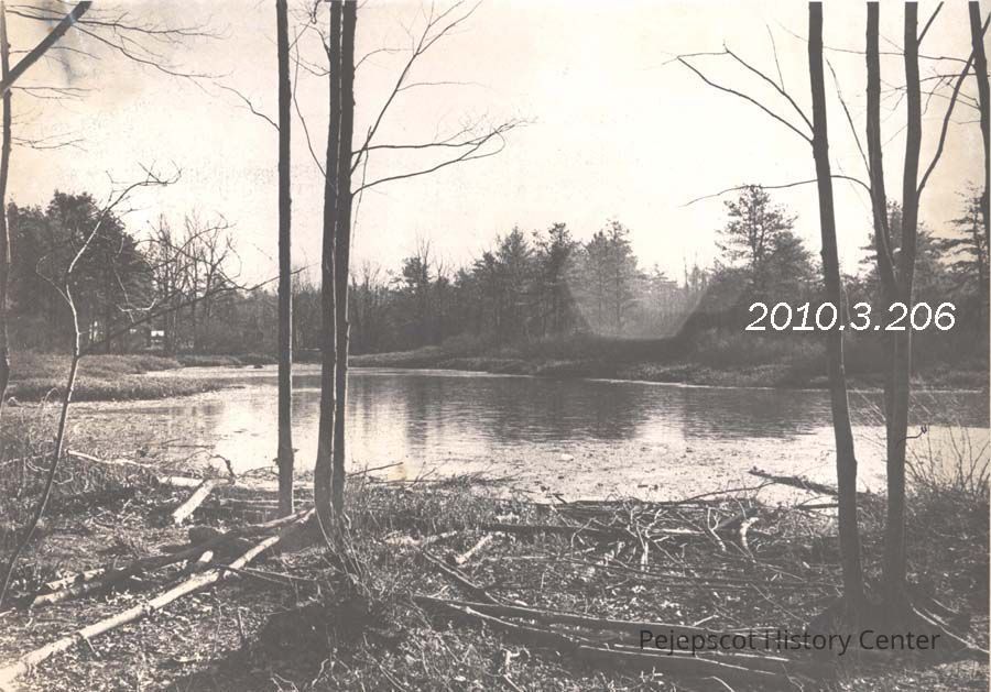 A B/W photograph of a pond between Maquoit and Mere Point Roads. Photo published 11/27/1970. Undated