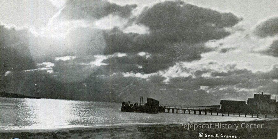 A B/W photo of Popham Beach steamboat Landing and Life Saving Station by moonlight.