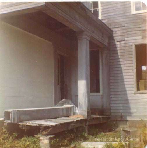 An undated color photograph of the porch of Elijah Kellogg House, Harpswell, Maine.