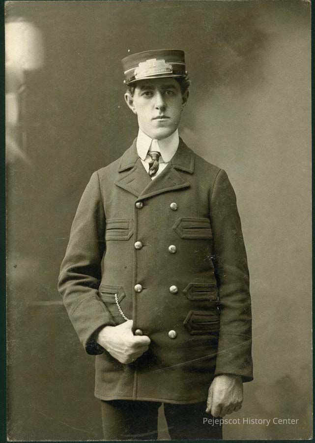 Black & white photograph of a young man in a what appears to be a streetcar conductor's uniform. The number 41 is visible on the cap