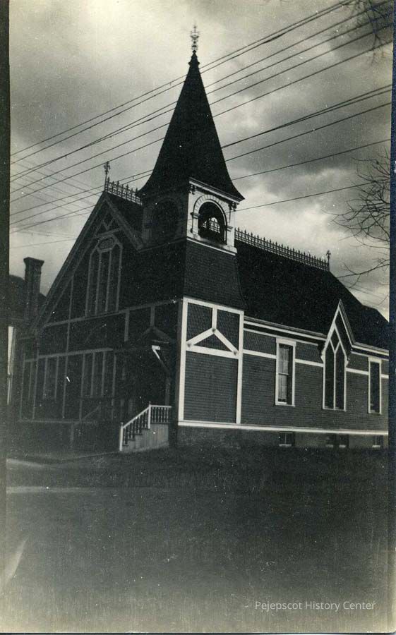 A black and white postcard of the Universalist Church on Pleasant Street in Brunswick.