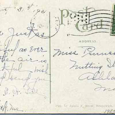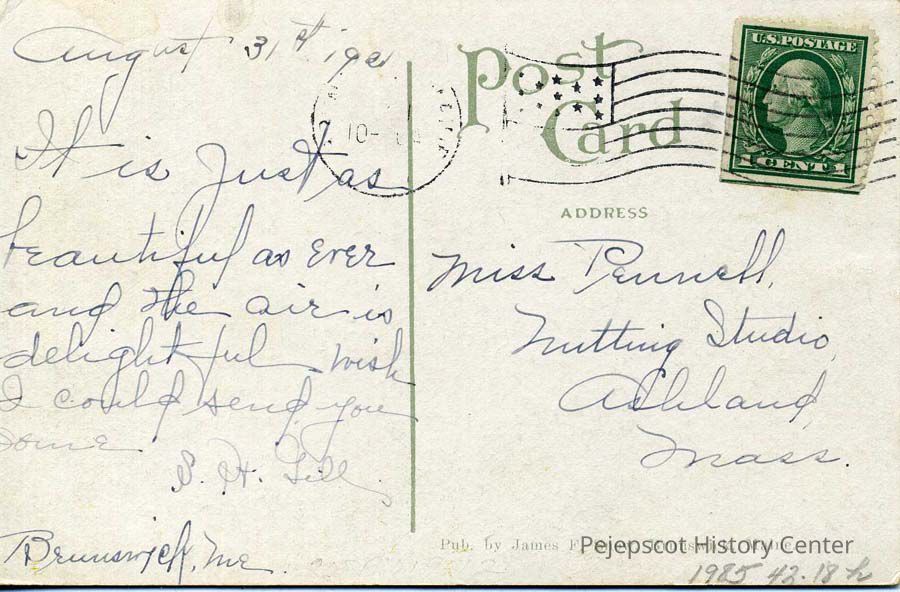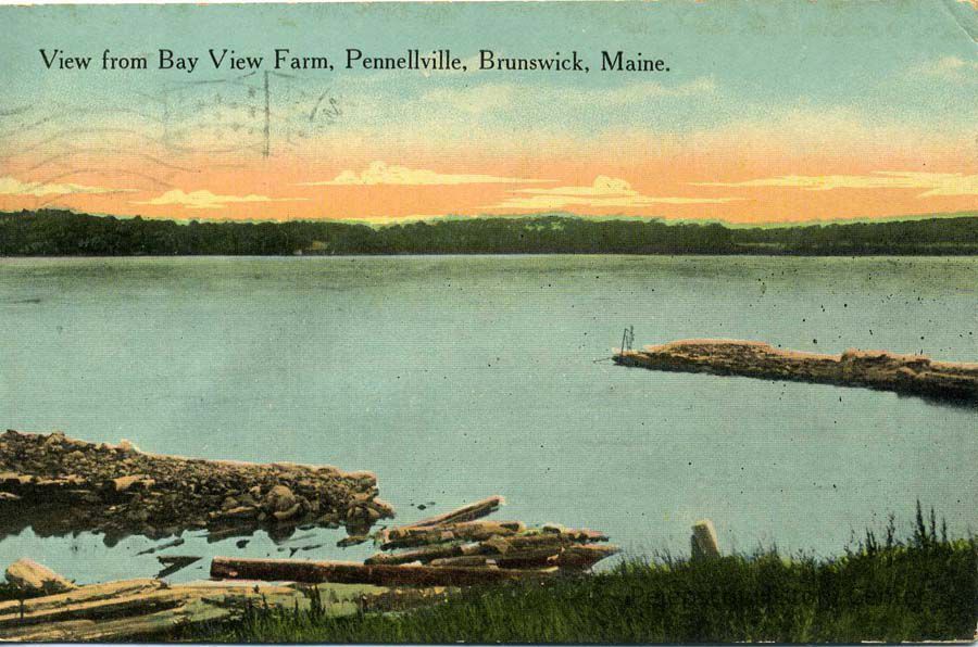An undated color postcard of the view from Bay View Farm in Pennellville, Brunswick. The postcard has a $0.01 stamp on the reverse and is addressed to "Miss Pennell, Nutting Studio, Ashland, Mass." with a message written in pencil (see accompanying photo).Collection
