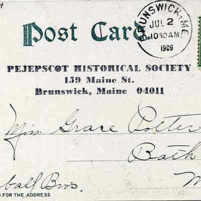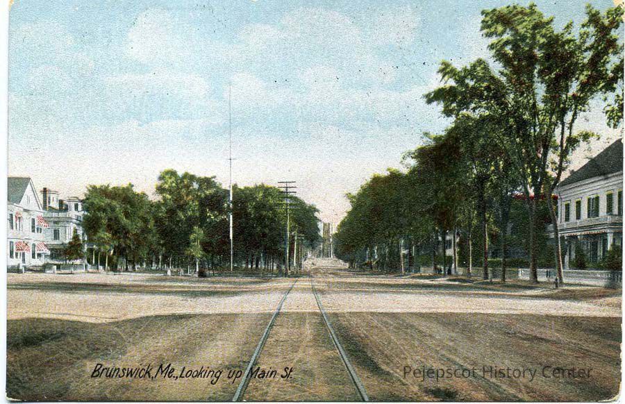Color-tinted postcard reading "Brunswick, Maine looking up Main Street.