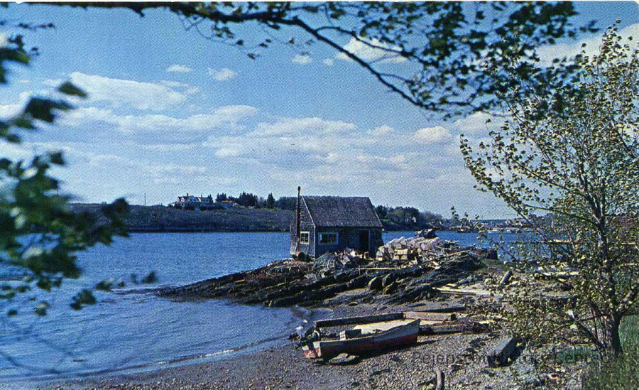 A colored picture postcard of Bailey Island. It shows Nubble Ledge and Mackerel Cove, Baily Island, Harpswell, Maine. Not dated.Collection