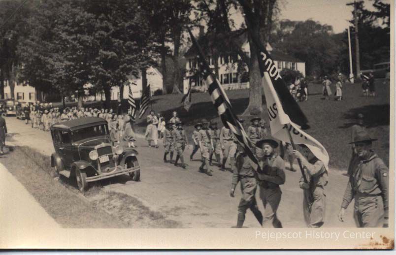 Postcard of parade on Elm Street, Topsham, Maine.