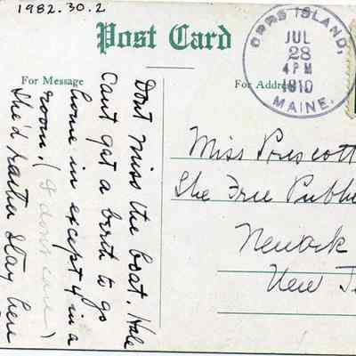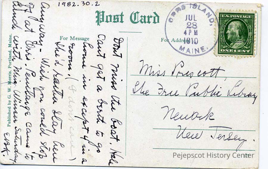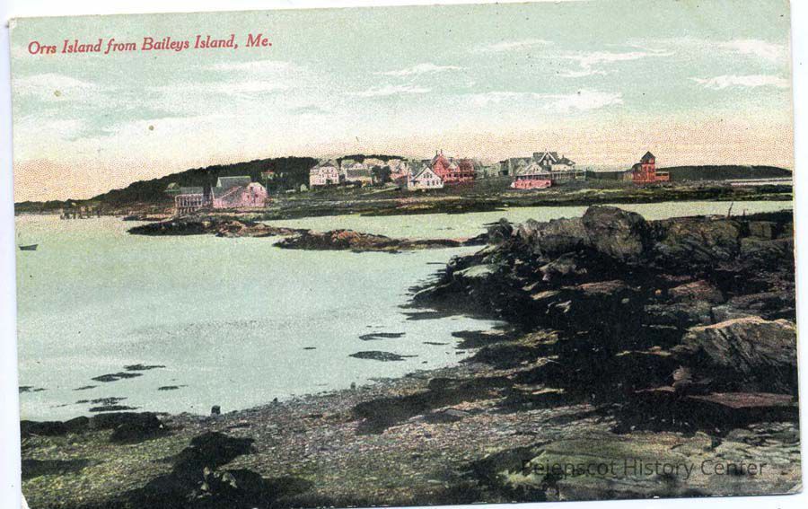 Color tinted postcard "Orr's Island from Baileys Island, ME." Postmarked July 28, 1910.