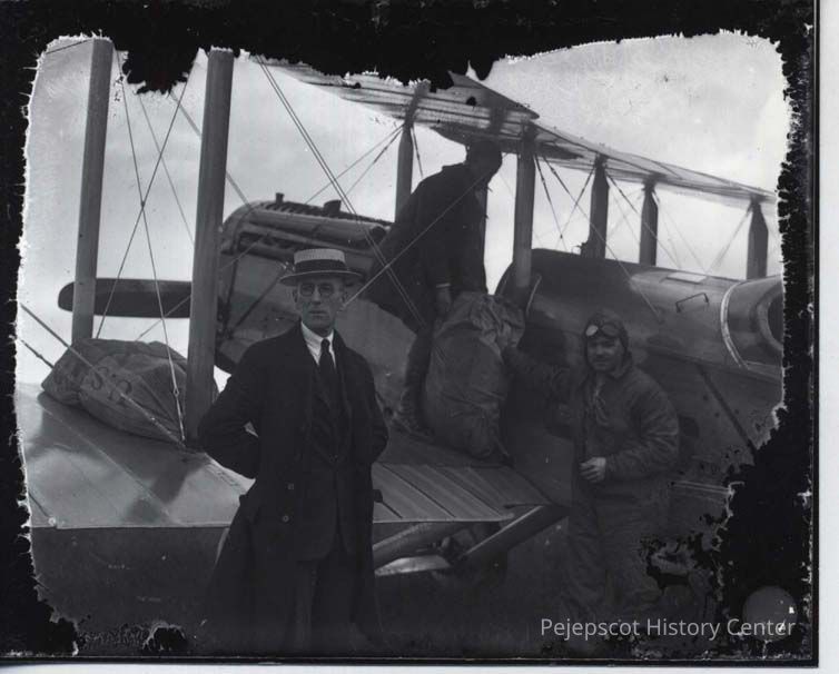 Photo of Postmaster Isaiah Elder and the first airmail from Brunswick, Maine, June 15 1922.