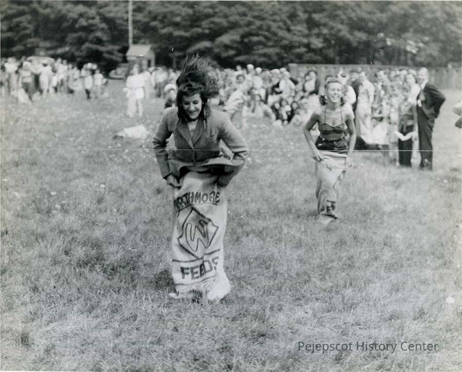 A B/W photograph of Verney Mill employees and their families at Verney Mill picnic at Thomas Point Beach. They are in a potato sack race. Undated