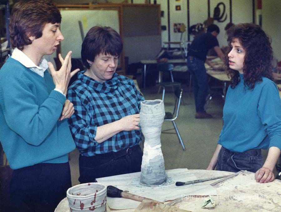 An undated color photo of three unidentified women view of a pottery class at Mt. Ararat School in Topsham, Maine.