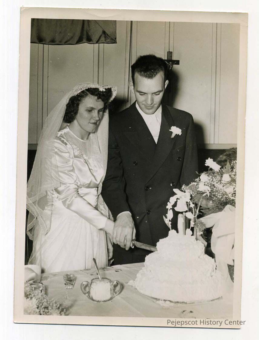 M. Rose Germaine Poulin and J. Rosaire Leo Poitras cutting the cake at their wedding. 10/20/1945