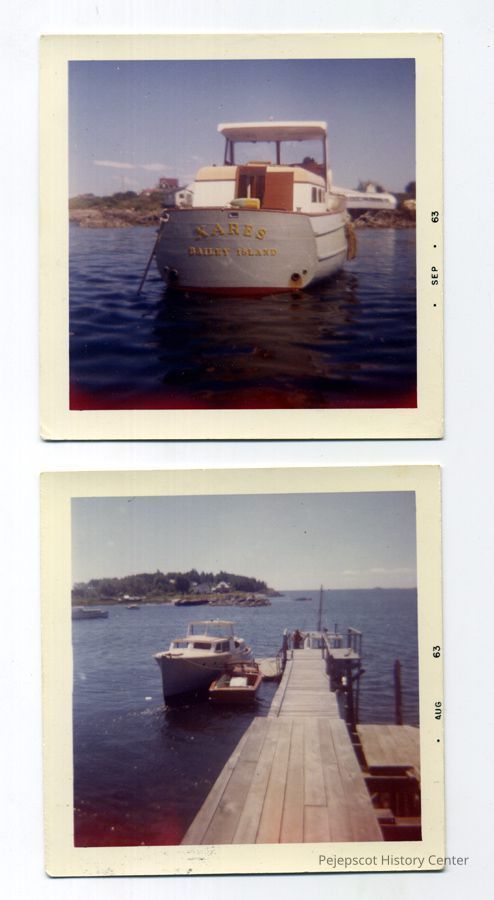 Two color photos of the power boat Xares of Bailey Island, shown at a wharf on either Bailey or Orr's Island, Harpswell, Maine. Photos dated Aug and Sep 63.