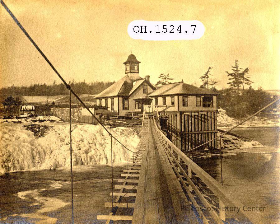 A B/W photograph of the power station on the Androscoggin River Falls, Brunswick, Maine. The photo was taken from the Brunswick side of the river and shows a wooden suspension bridge leading to the power station, located on an island in the center of the river. Dated 1898.