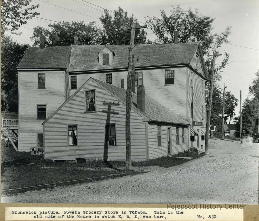 A black and white photo of Powers Grocery Store in Topsham. A note at the bottom of the photo says, "This is the old site of the House in which E.W.D. was born." Undated