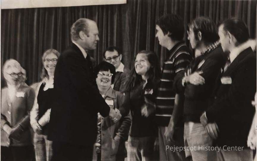 A black and white photo of Charlotte Byers of Newcastle, Republican representative from District 60 to the Maine House, was published in The Times Record in Brunswick Maine, on 9/2/1975 along with a feature story about Byers. Ford was at the AFL-CIO Field Day in Augusta a few days earlier when the photo was taken. Also in the photo are state representatives Richard Pierce of Waterville in the striped shirt and Edward Kelleher of Bangor.Collection