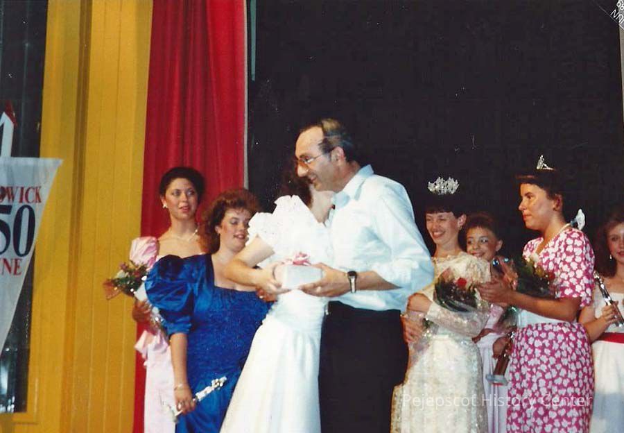 A color photograph of Chressie Gagne presenting a gift to Gene Gagne from he contestants.