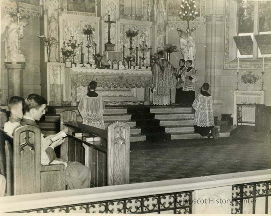 A B/W photograph of a priest and altar boys at the altar of St. John's Church. Undated