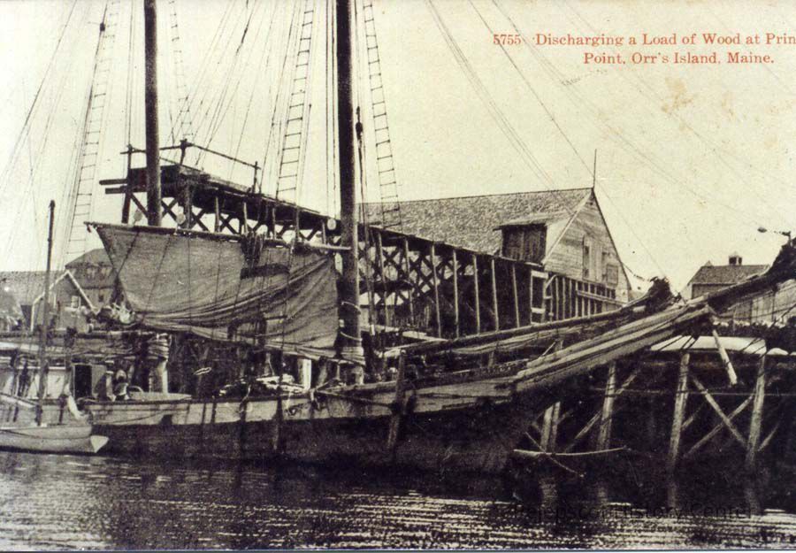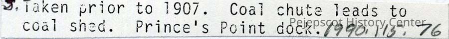 A color print copy of Prince's Point Dock. Photo taken prior to 1907. The vessel is unloading lumber.
