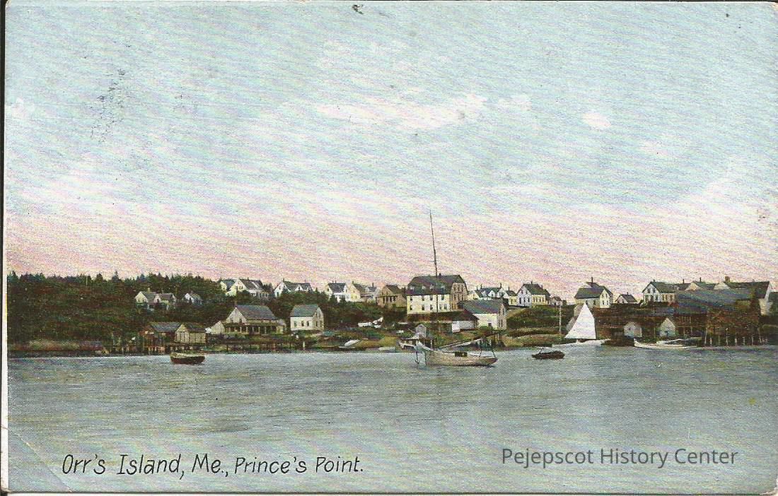 A color picture postcard of Orr's Island, Me, Prince's Point. The card has a 1 cent stamp attached and was postmarked. It was sent by Angie to Mrs. Archie Rowe, New Gloucester, Maine. Dated 07/26/1910.Lexicon
