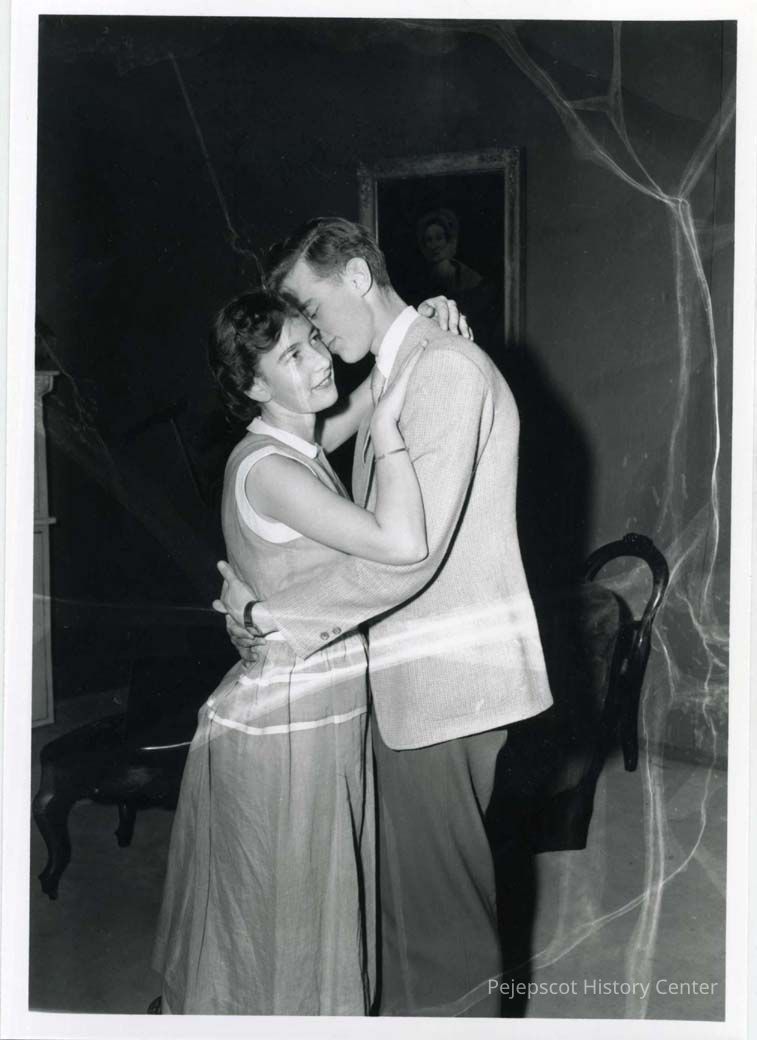 Two young people embrace . They are the principal actors, Maureen Routhier and Jonathan Helmreich, rehearsing for the Senior Play, "The Family Circle", on November 15, 1953.Lexicon