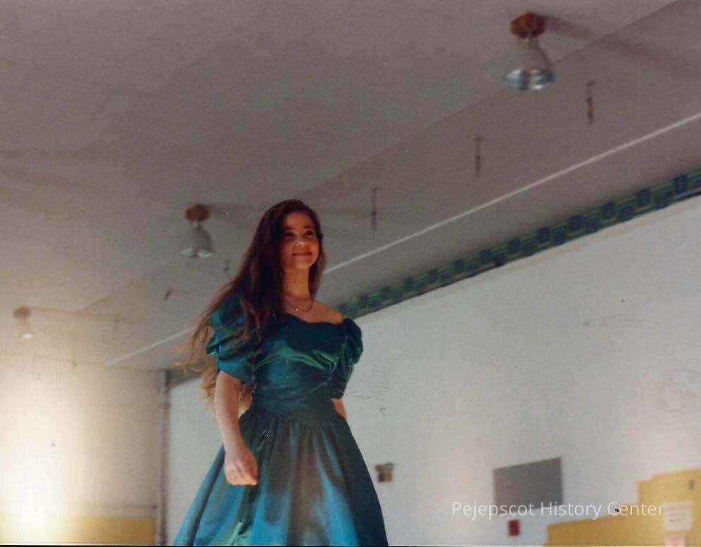 A color photograph of Mara Kane practicing her Gown walk,. Photographers # 1-8 CYO sponsored