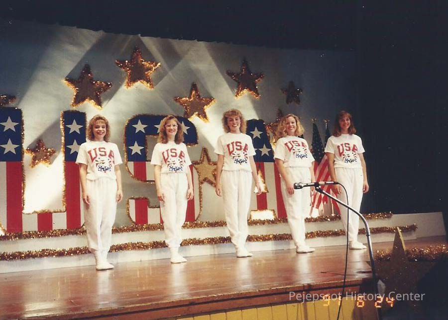 A color photograph of 5 unknown girls in USA costumes. CYO sponsored