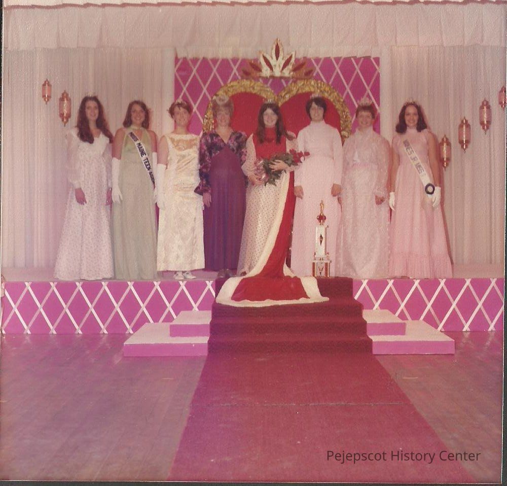 The Queens from L. to R. Barbara Aldridge 73-74, Miss. Maine Teenager 74 Lisa Frateschi, Agnes Racine 72-73, Kristina Warmingss 64-65, Debebra Jellison 74-75, Doris Bernier 71-72, Sharon Hinckley 68-69 and Maine's Jr. Miss 74 Pauline Cloutier.Collection