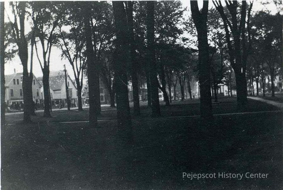 A black and white photo of the Brunswick Mall, looking north. The gazebo at the north tip of the mall is visible, as are some of the buildings on the west side of Maine Street.Collection