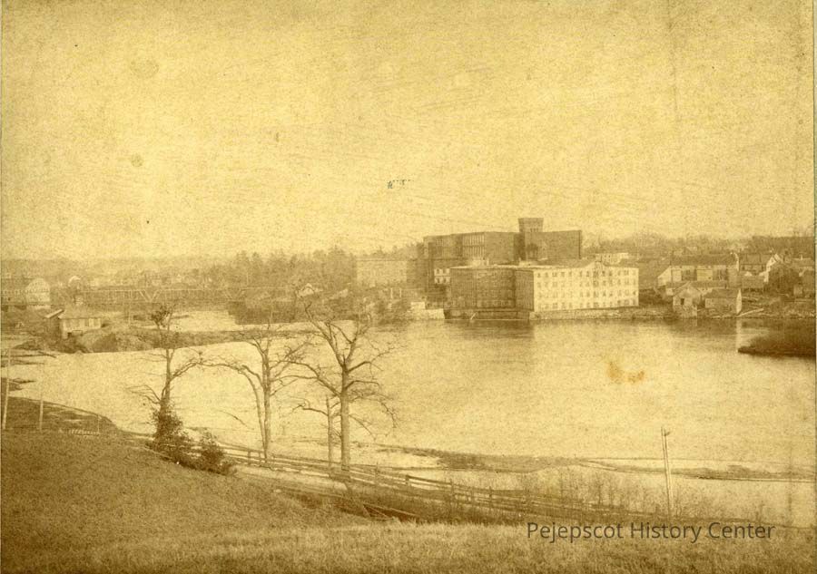 A sepia-toned photo of the Cabot Mill, Androscoggin River Falls and the power station taken from Topsham looking east.