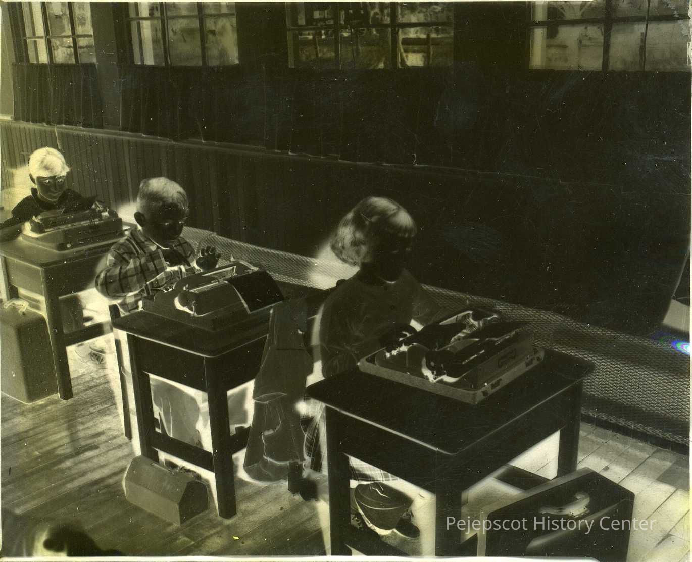 B/W photo negative (1956) of a room full of first graders learning to type with portable typewriters on their desk. Being shown, by Mrs. Katerine Ball, how one distinguishes between small and capital letters.