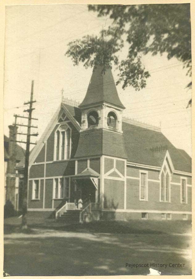 A sepia-toned photo of the Unviersalist Church on Pleasant Street in Brunswick.