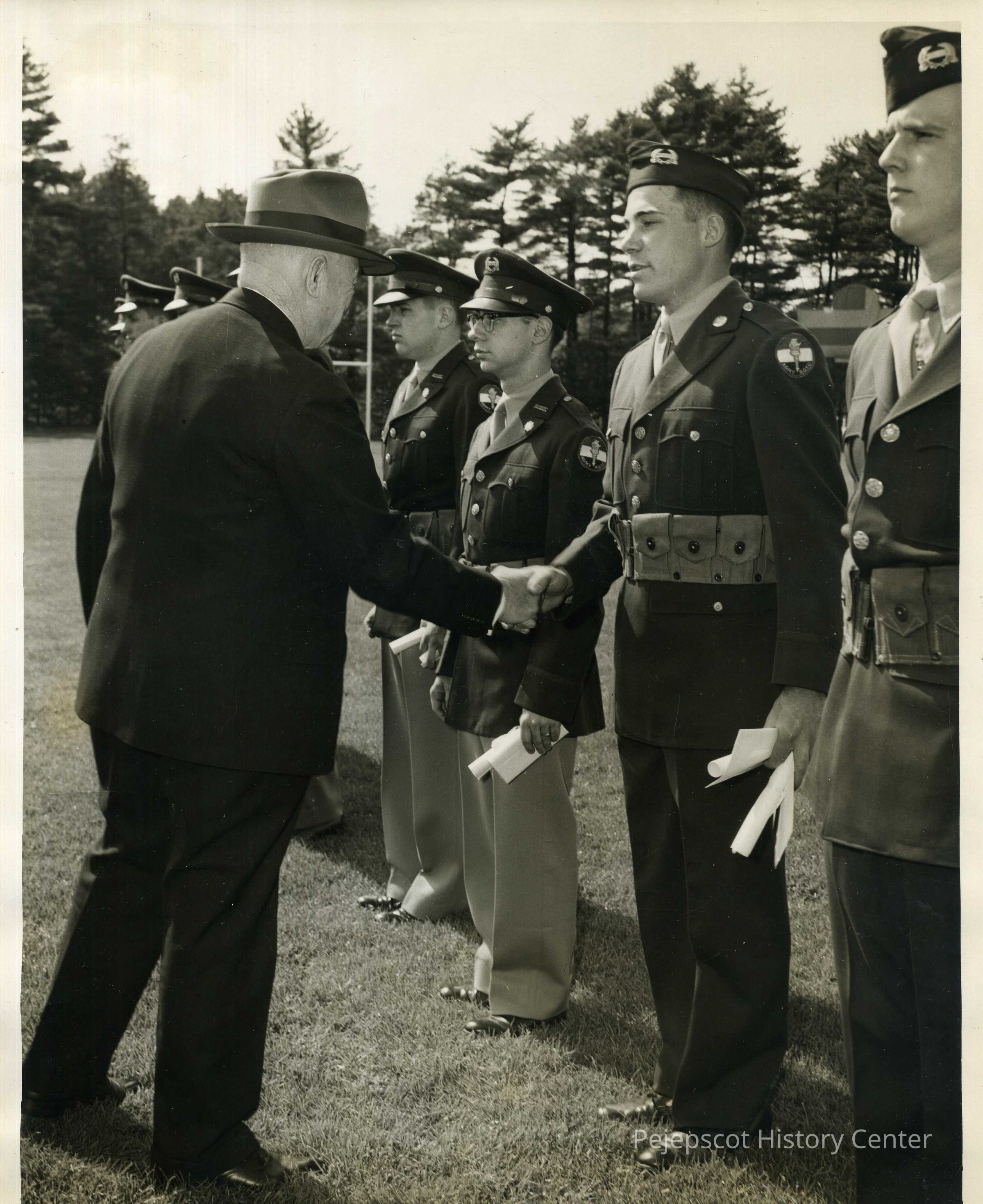 B/W photo; Ed Wheeler congratulating Bowdoin ROTC cadet Andrew W. Williamson III, 1953.
