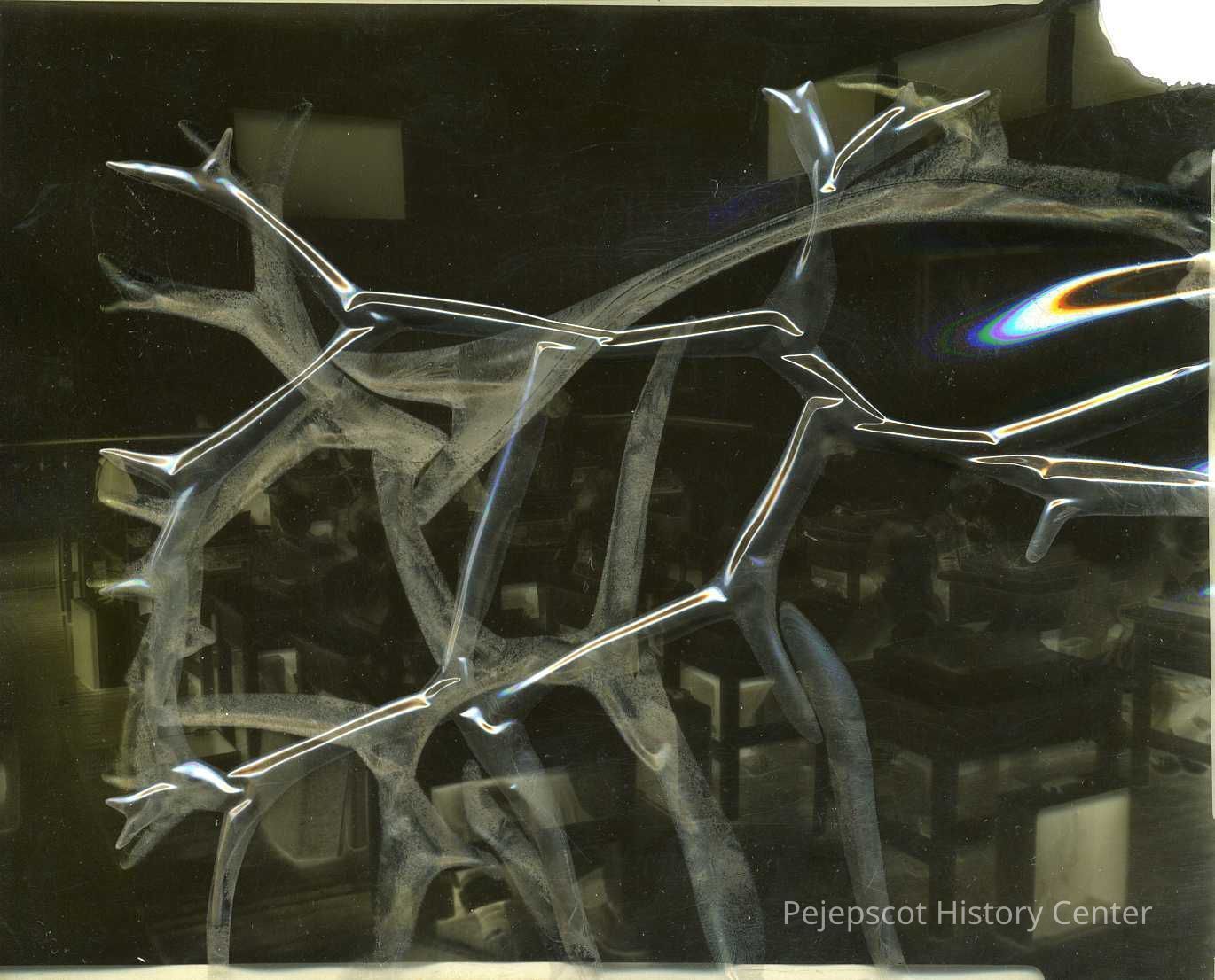 B/W photo negative (1956) of 1st graders learning to type with portable typewriters on their desk. Being shown by Mrs. Katherine Ball how we distinquish between small and capital letters.