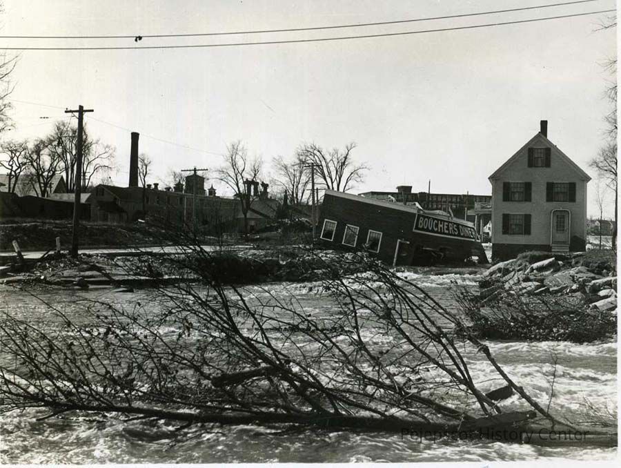 Flood scene of Topsham. Boucher's Diner is in the middle of the photo, with the Cabot Mill behind it.