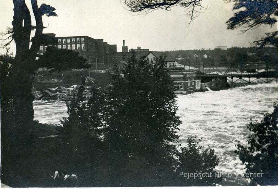 A black and white photo of the Cabot/Verney Mill and the Frank Wood Bridge.