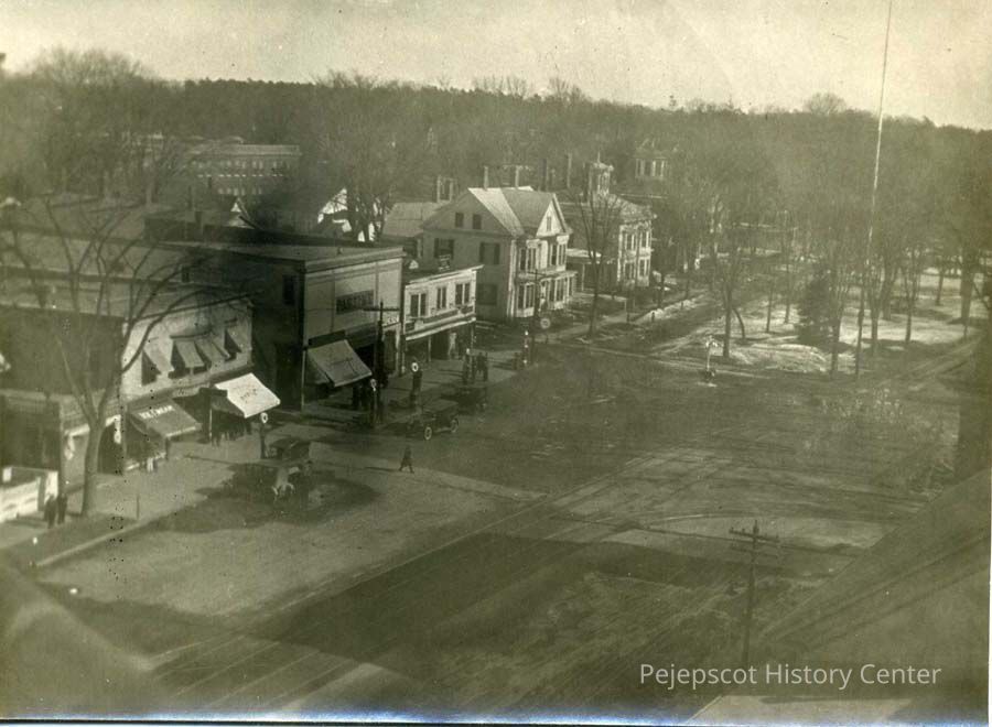 A sepia-toned view of southern Maine Street, Park Row and the Mall. The photo was probably taken from the tower of the Old Town Hall. The Pastime Theater is visible on the east side of Maine, as are what is now called the Pumpkin House (at the corner of Park Row & School Street), the Skolfield House and the Skolfield-Whittier House.Collection